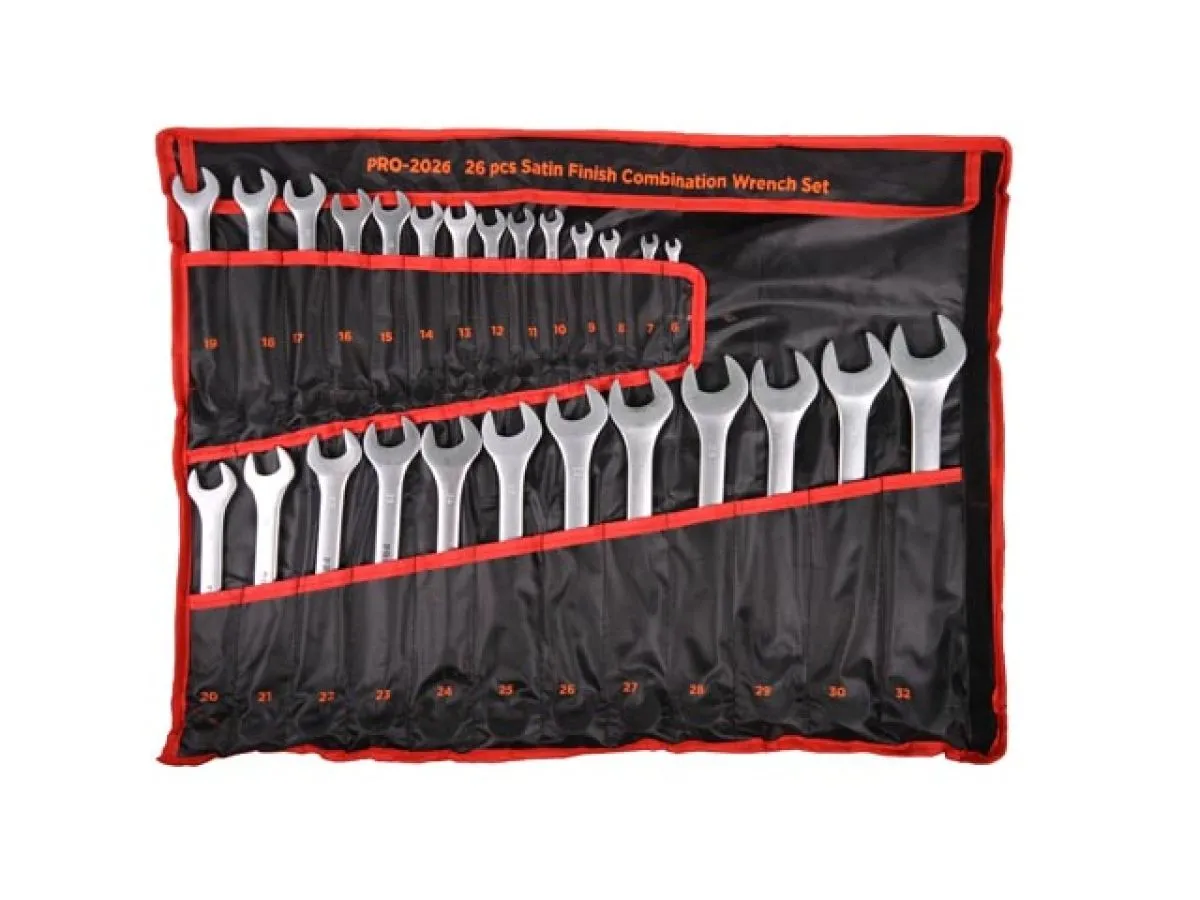 Набор ключей комбинированных 26 предметов, Cr-V. В набор входят ключи следующих размеров: 6, 7, 8, 9, 10, 11, 12, 13, 14, 15, 16, 17, 18, 19, 20, 21, 22, 23, 24, 25, 26, 27, 28, 29, 30, 32 мм.