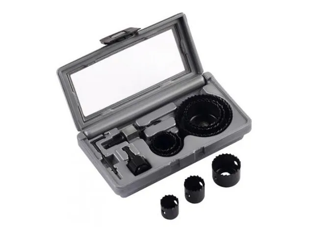 Набор пильных венцов состоит из 11 предметов. Включает в себя 8 коронок 22/25/29/35/38/44/51/68 мм, переходники и ключ.