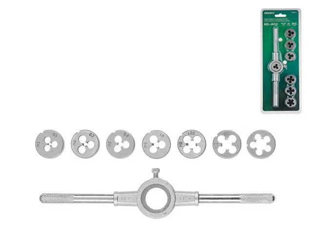 плашки: 7 шт. М3 x 0,5 мм, М4 x 0,7 мм, М5 x 0,8 мм, М6 x 1 мм, М8 x 1,25 мм, М10 x 1,5 мм, М12 x 1,75 мм,