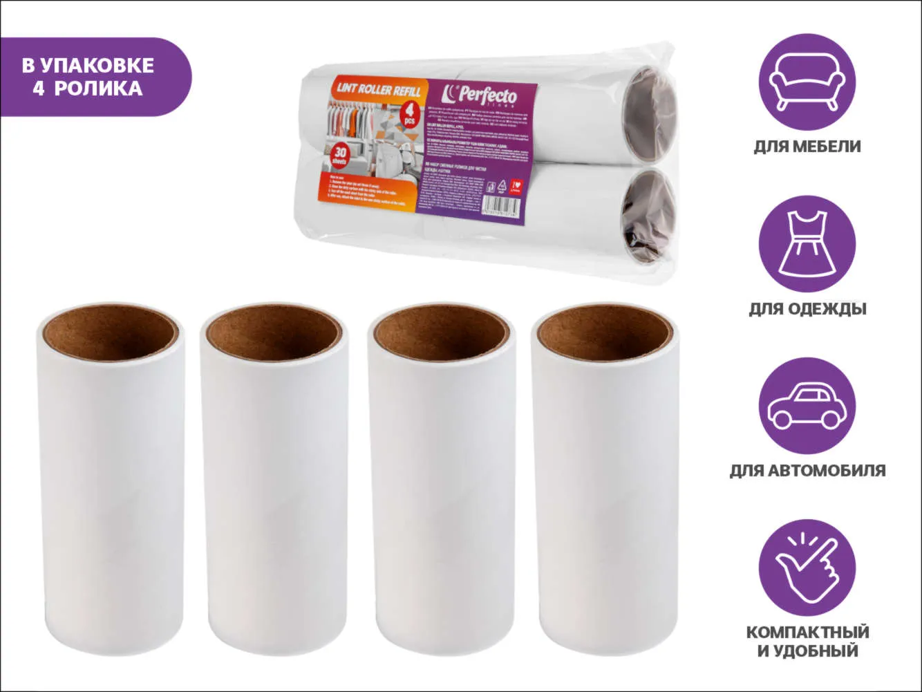Набор сменных роликов для чистки одежды PERFECTO LINEA включает 4 ролика по 30 отрывных листов каждый. Липкая поверхность эффективно удаляет пыль, волосы, шерсть и мелкий мусор с одежды, мебели и текстильных изделий. Листы легко снимаются, ролики компактны и удобны в использовании.