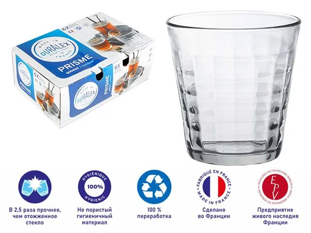 Коллекция Prisme - проявление моды во всех ее гранях. Практичные, эстетичные, прочные и эргономичные стаканы культового бренда ТМ Duralex . Стеклянная посуда ТМ Duralex производится во Франции с 1945 года. Процесс закаливания придает стеклу ТМ Duralex особую прочность. Во время закаливания стекло ТМ Duralex предварительно нагретое до 700°С, подвергается резкому охлаждению холодным воздухом. Этот процесс делает стекло ТМ Duralex в 2,5 раза более устойчивым к механическим повреждениям, чем отожженное стекло. Характеристики: ударопрочное закаленное стекло, термостойкость до 130 ° C (EN 1183), можно мыть в посудомоечной машине, подходит для использования в микроволновой печи.