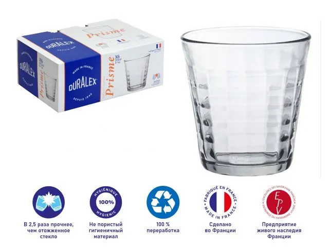 Коллекция Prisme - проявление моды во всех ее гранях. Практичные, эстетичные, прочные и эргономичные стаканы культового бренда ТМ Duralex . Стеклянная посуда ТМ Duralex производится во Франции с 1945 года. Процесс закаливания придает стеклу ТМ Duralex особую прочность. Во время закаливания стекло ТМ Duralex предварительно нагретое до 700°С, подвергается резкому охлаждению холодным воздухом. Этот процесс делает стекло ТМ Duralex в 2,5 раза более устойчивым к механическим повреждениям, чем отожженное стекло. Характеристики: ударопрочное закаленное стекло, термостойкость до 130 ° C (EN 1183), можно мыть в посудомоечной машине, подходит для использования в микроволновой печи.