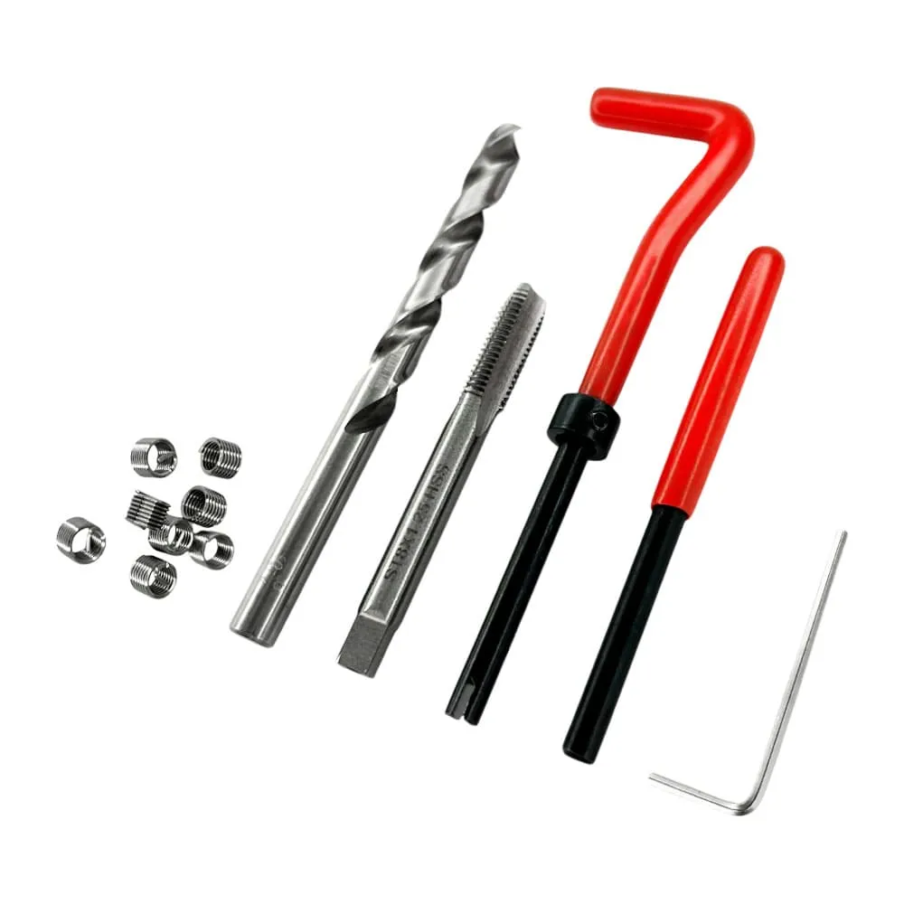В наборе сверло, метчик, поводок для установки резьбовых вставок, выколотка для обламывания установочного хвостовика и 12 вставок.