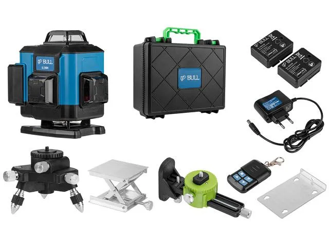 Компактный нивелир отличается зеленым диодом, позволяющим работать в условиях высокой освещенности. Лазерный нивелир BULL оснащен немецкими LD лазерами компании OSRAM. Имеет проекцию четырех плоскостей по 360 градусов. Корпус прорезинен, что выполняет противоударную функцию. Может быть использован как внутри помещения так и вне помещения для измерения до 60 м с приемником. Управление может осуществляться дистанционно за счет специального пульта. Модель оснащена голосовым информированием включения, отклонения от плоскости, степенью яркости луча.