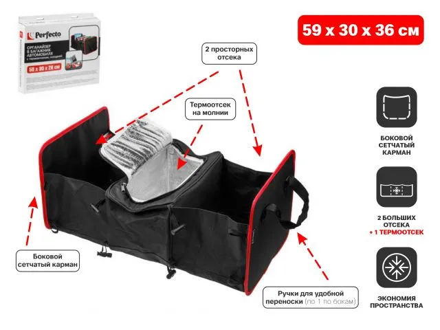 Органайзер в багажник автомобиля, с термоотсеком, складной, 59х30х26 см, PERFECTO LINEA