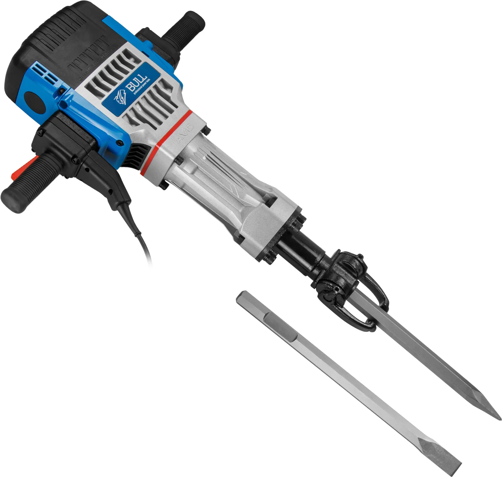 Отбойный молоток предназначен для дробления бетона, слома бетонных покрытий, проделывания проёмов, а также ведения самых сложных демонтажных работ. Шестигранный патрон НЕХ 28 мм позволяет надежно фиксировать долота, а также обеспечить удобство смены. Модель обладает особой системой системой виброгашения, что делает работу менее утомительной для оператора. Корпус редуктора изготовлен из магниевого сплава, что обеспечивает дополнительную защиту внутренних узлов, а также лучший отвод тепла. Обладает оптимальным удобством использования: эргономичные рукоятки с мягкой накладкой и низко расположенный центр тяжести инструмента обеспечивают оптимальный комфорт в использовании. Отбойный молоток BULL также имеет морозоустойчивый резиновый кабель 5 м.