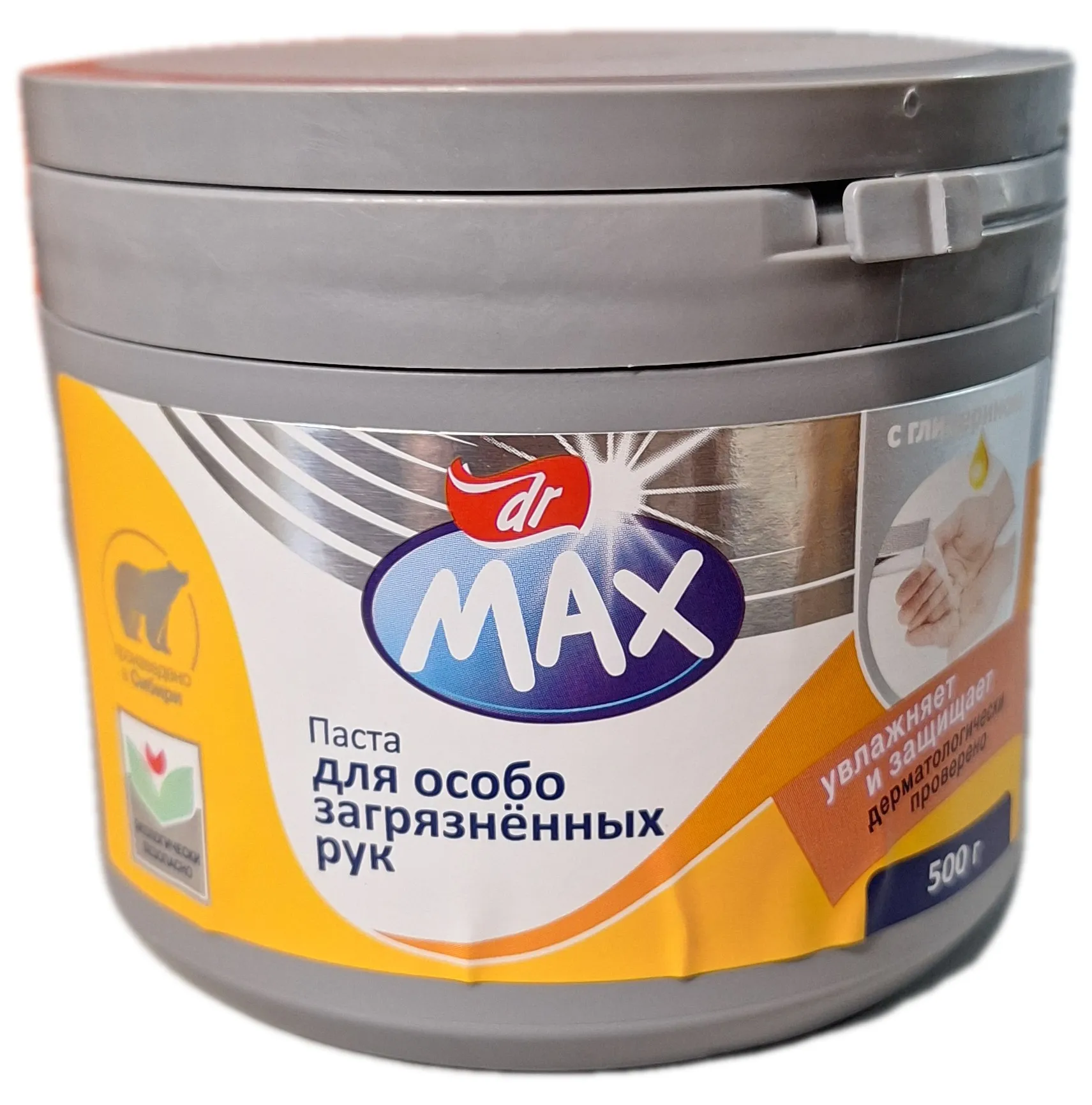 Паста с глицерином для особо загрязнённых рук марки DR.MAX . Эффективно удаляет с ладоней рук различного вида загрязнения, в том числе ржавчину, пыль, смазочные масла и т.п. Содержит сложные эфиры глицерина, которые влияют на свойство (способность) пасты питать кожу, а также предотвращают высушивание эпидермы. Продукты биоразлагаемые и не наносят вред окружающей среде. При этом паста применяется в промышленности и быту: после работ, связанных с применением масел, смазок, жира, сажи, графита, смол, металлической пыли. Также используется после ремонта автомобиля, строительных работ, после работы в саду.
