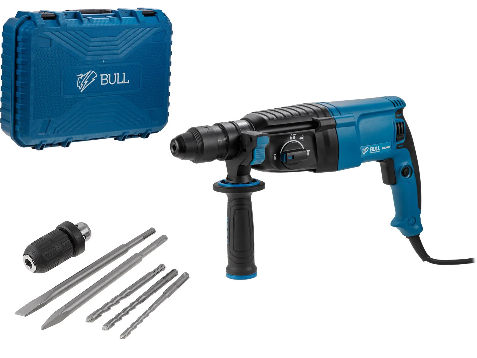 Перфоратор BULL BH 2602 в чем. 800 Вт, 3.0 Дж, 4 реж. + 2 зубила, 3 сверла, БЗП в комплекте