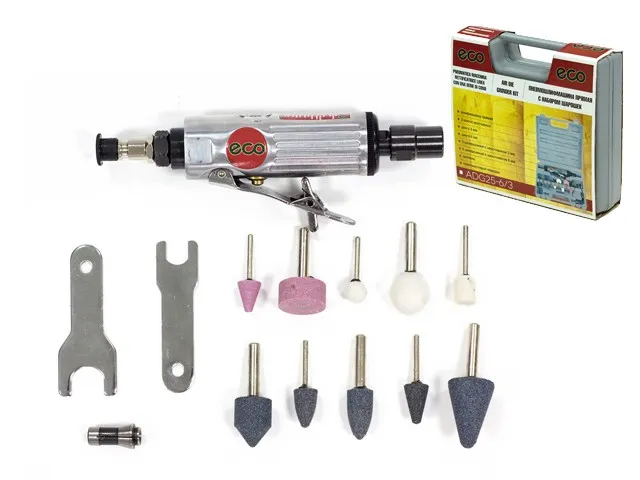 Пневмошлифмашина прямая ECO ADG25-6/3 с набором шарошек (25000 об/мин, 115л/мин)
