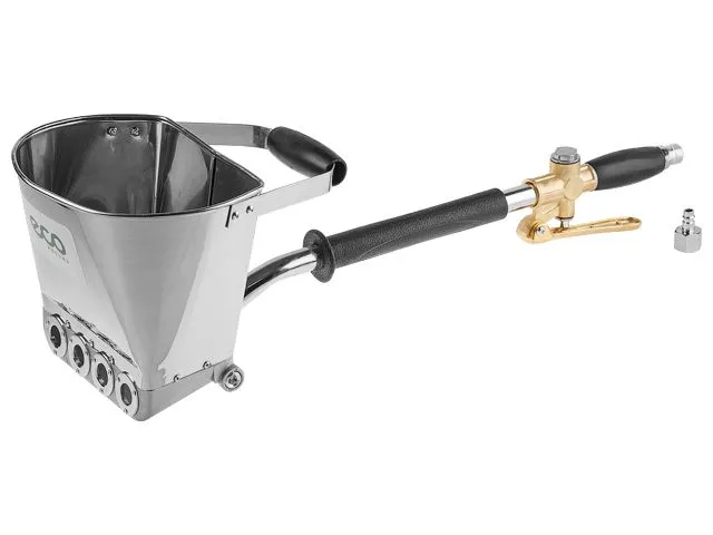 Хоппер-ковш предназначен для нанесения строительных смесей (штукатурки, бетона, глины) на поверхность бетонных или железобетонных конструкций под давлением сжатого воздуха, что дает плотное взаимодействие наносимого состава с поверхностью, заполнение трещин, раковин и пор, а также значительно ускоряет нанесение смесей по сравнению с ручным способом.