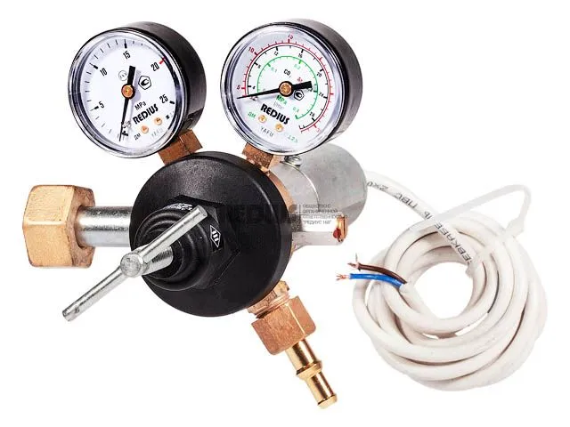 Регулятор расхода баллонный одноступенчатый предназначен для понижения и регулирования давления углекислого газа или аргона, поступающего из баллона, и автоматического поддержания постоянного рабочего расхода газа на выходе регулятора в ходе проведения работ. Подогреватель используется для предотвращения замерзания механизмов редуктора при больших расходах газа или при низких температурах окружающей среды. Подогрев осуществляется за счет теплообмена между газом и горячими стенками корпуса подогревателя.