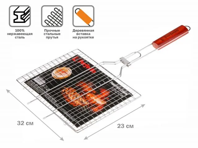 Решетка-гриль, 320x230 мм, нержавеющая сталь, деревянная ручка, PERFECTO LINEA
