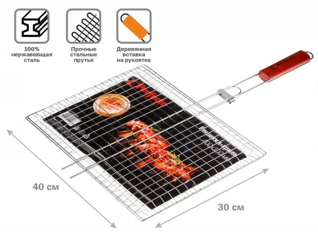 Решетка-гриль, 400x300 мм, нержавеющая сталь, деревянная ручка, PERFECTO LINEA