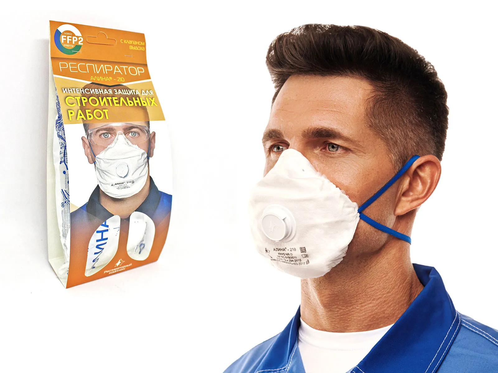 АЛИНА-210 – фильтрующий респиратор второго класса (FFP2) с клапаном выдоха. Защищает от всех видов аэрозолей при их концентрации до 12 ПДК.