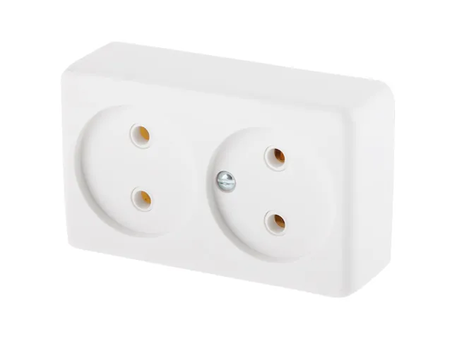 Розетка двухместная открытой установки, с монтажной панелью предназначена для присоединения электрических приемников с номинальным напряжением 250 В к электрической сети переменного тока в нормальных климатических условиях внешней среды по ГОСТ 15150 и ГОСТ 15543.1.