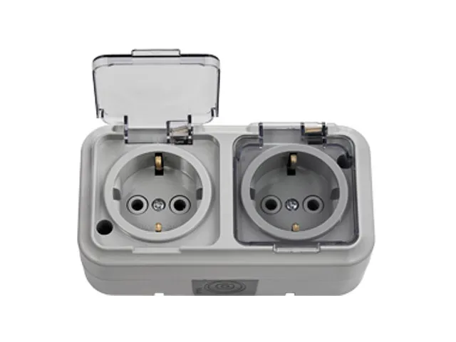 Розетка 2-ая (открытая, с/з, брызг. защ.) серая, Пралеска Аква, Bylectrica