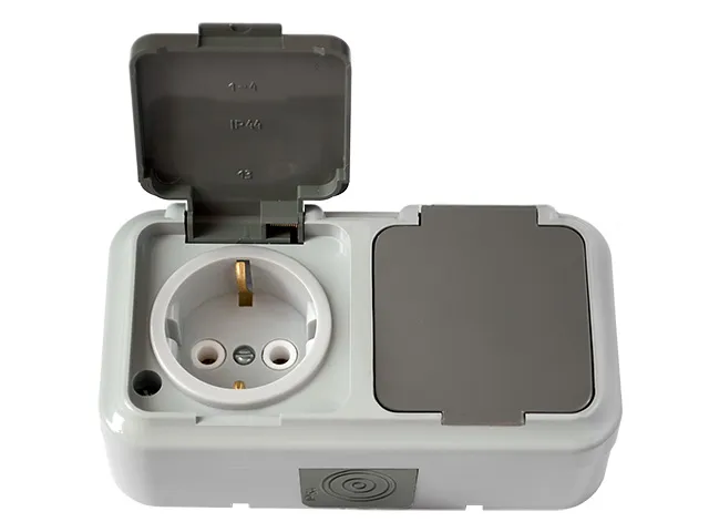 Розетка 2-ая (открытая, с/з, брызг. защ.) серая, Пралеска Аква, Bylectrica