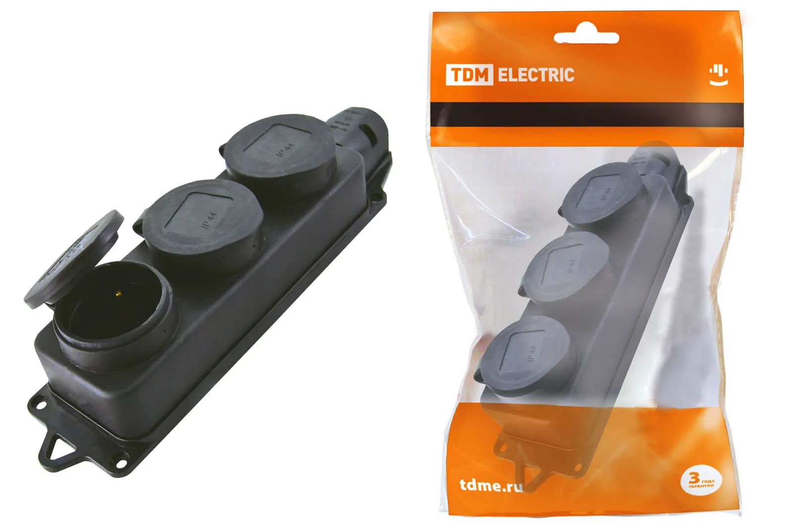 Розетка трехместная с заглушками каучук 2Р+РЕ 16А 250В IP44 TDM