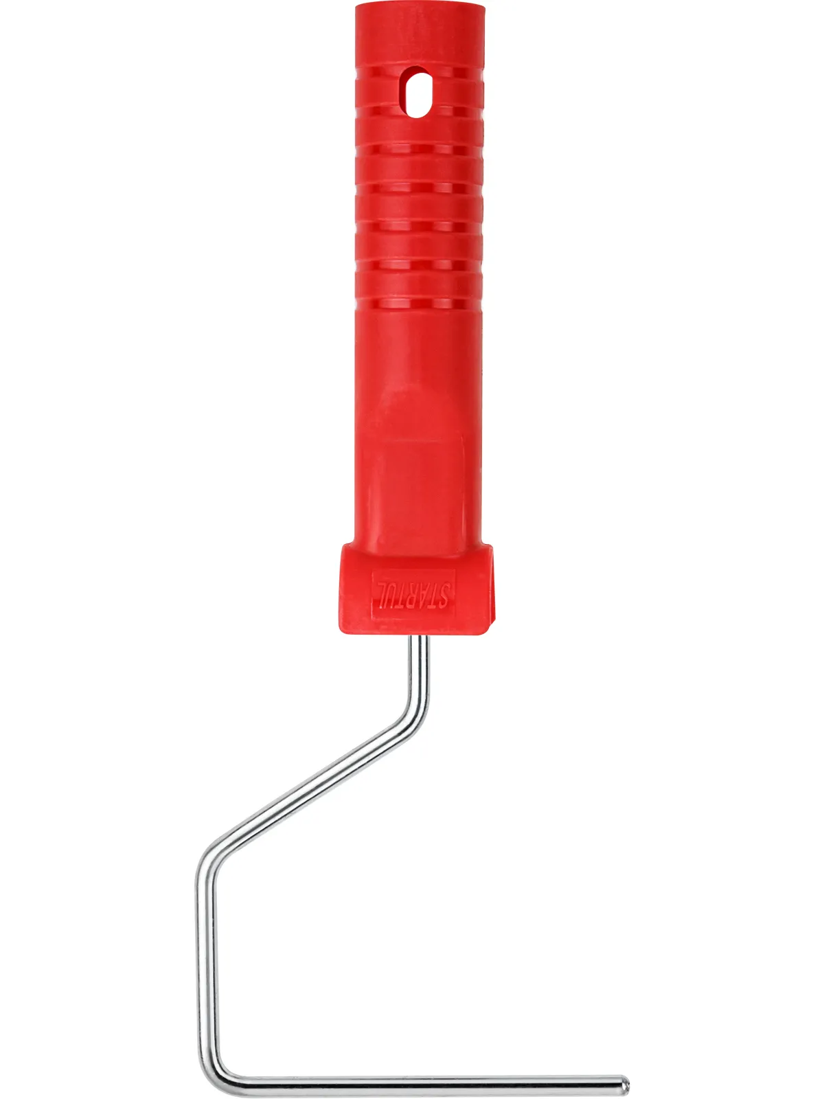 Описание: стальной изогнутый стержень, оснащенный эргономичной пластмассовой рукоятью. Технологическое отверстие в рукояти облегчает конструкцию инструмента и позволяет использовать телескопические стержни для покраски труднодоступных участков,