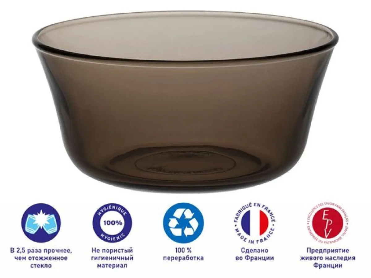 Салатник Lys из сверхпрочного закаленного стекла от ТМ Duralex - надежный помощник в приготовлении любимых рецептов. Классический темный цвет стекла придаст изысканный вид сервировке стола. Ударопрочное стекло обеспечивает привлекательный внешний вид и устойчиво к появлению царапин. Салатники компактны в хранении и экономят место на кухне, ведь их удобно штабелировать. Стеклянная посуда ТМ Duralex производится во Франции с 1945 года. Процесс закаливания придает стеклу ТМ Duralex особую прочность. Во время закаливания стекло ТМ Duralex , предварительно нагретое до 700°С, подвергается резкому охлаждению холодным воздухом. Этот процесс делает стекло ТМ Duralex в 2,5 раза более устойчивым к механическим повреждениям, чем отожженное стекло. Характеристики: ударопрочное закаленное стекло, термостойкость до 130 ° C (EN 1183), можно мыть в посудомоечной машине, подходит для использования в микроволновой печи.