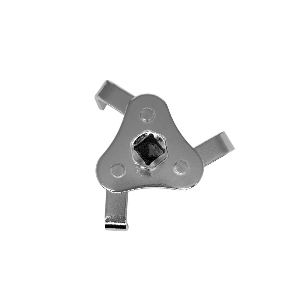 Съемник имеет 3 плоских захвата, которыми он зажимает фильтр. Съемник масляного фильтра трехлапый можно вращать универсальным или накидным ключом и головкой, что актуально в условиях ограниченного пространства при плотном размещении узлов и агрегатов мотора.
