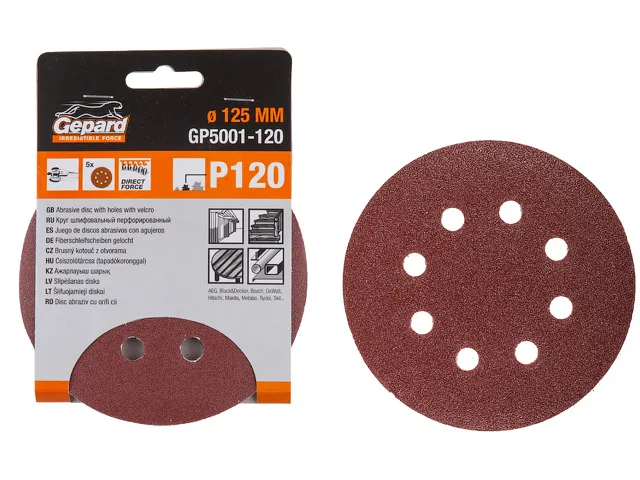 Схожий товар (без отверстий): GP5014-40 Шлифлист 125мм круг Р40 ддерева 5шт. GEPARD (GP5014-40)