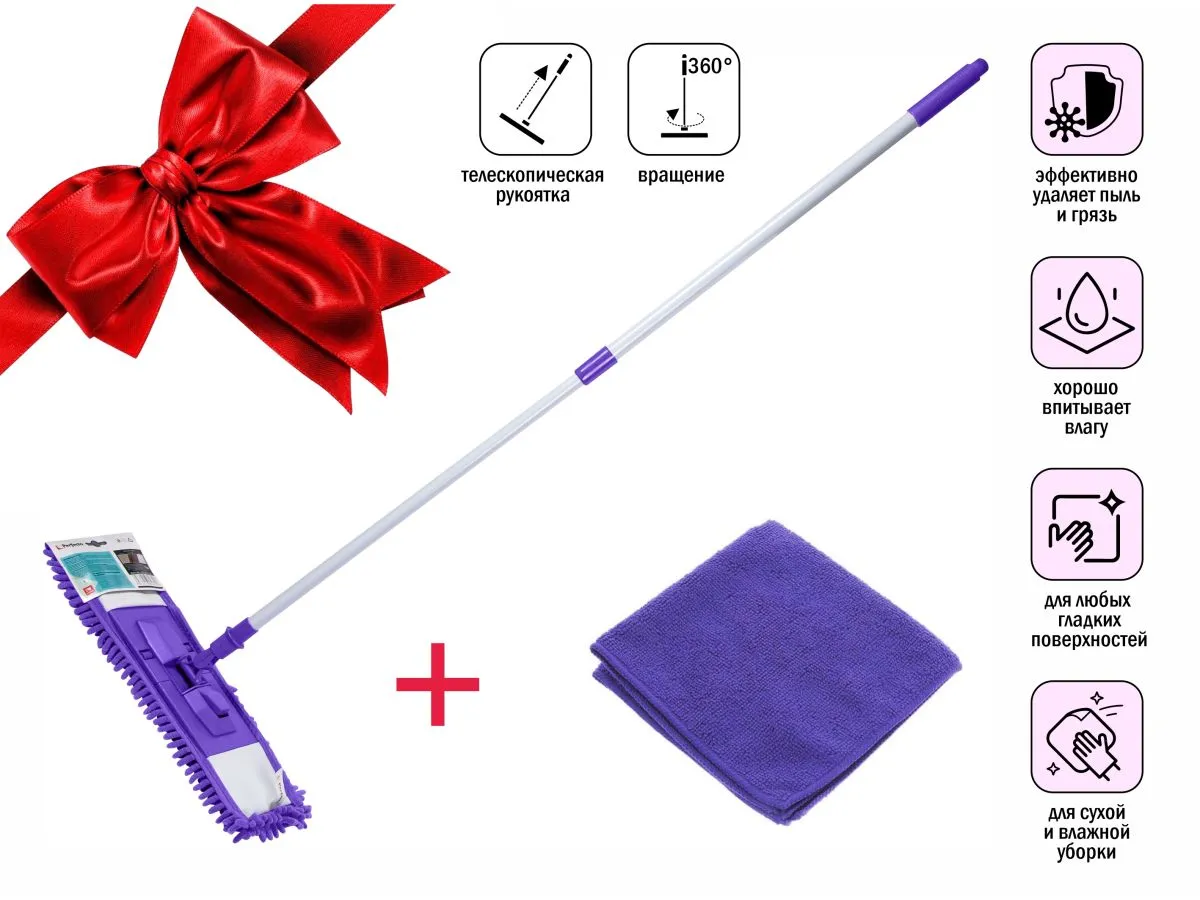 Швабра для пола с насадкой из шенилла, лиловая + салфетка из микрофибры 30х30 см, PERFECTO LINEA