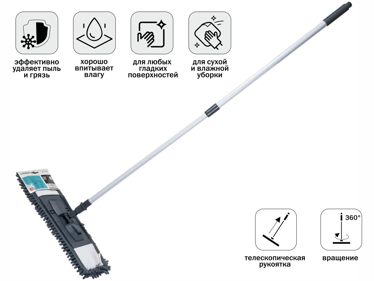 Швабра с практичной ножной педалью. Способна вращаться 360 для удобного использования. Предназначена для сухой и влажной уборки гладких поверхностей (пола, стен, потолков). Идеально подходит для мытья линолеума, паркета, ламината, кафеля. Более гигиенично собирает и удерживает пыль, грязь,жидкость.