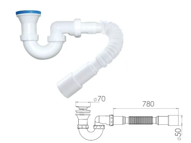 Сифон для душевого поддона U-образный h 130mm, выпуск 70 мм, с гибкой трубой 1 1/2" - 40/50мм, AV