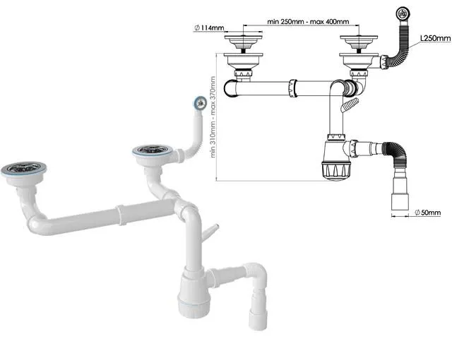 Двойной сифон бутылочного типа для керамической мойки с круглым переливом.