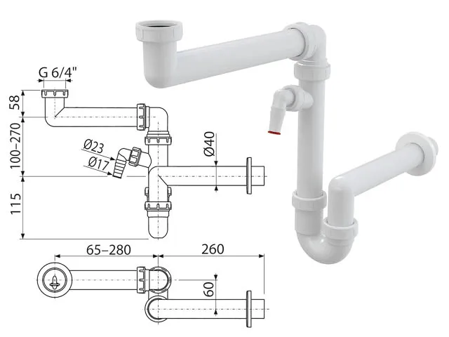 Сифон для мойки экономящий пространство cо штуцером и накидной гайкой 6/4, Alcaplast