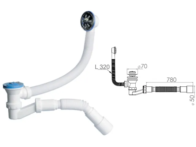 Сифон для ванны низкий h120mm, с выпуском и переливом 70мм, с гибкой трубой 40х40/50, AV Engineering