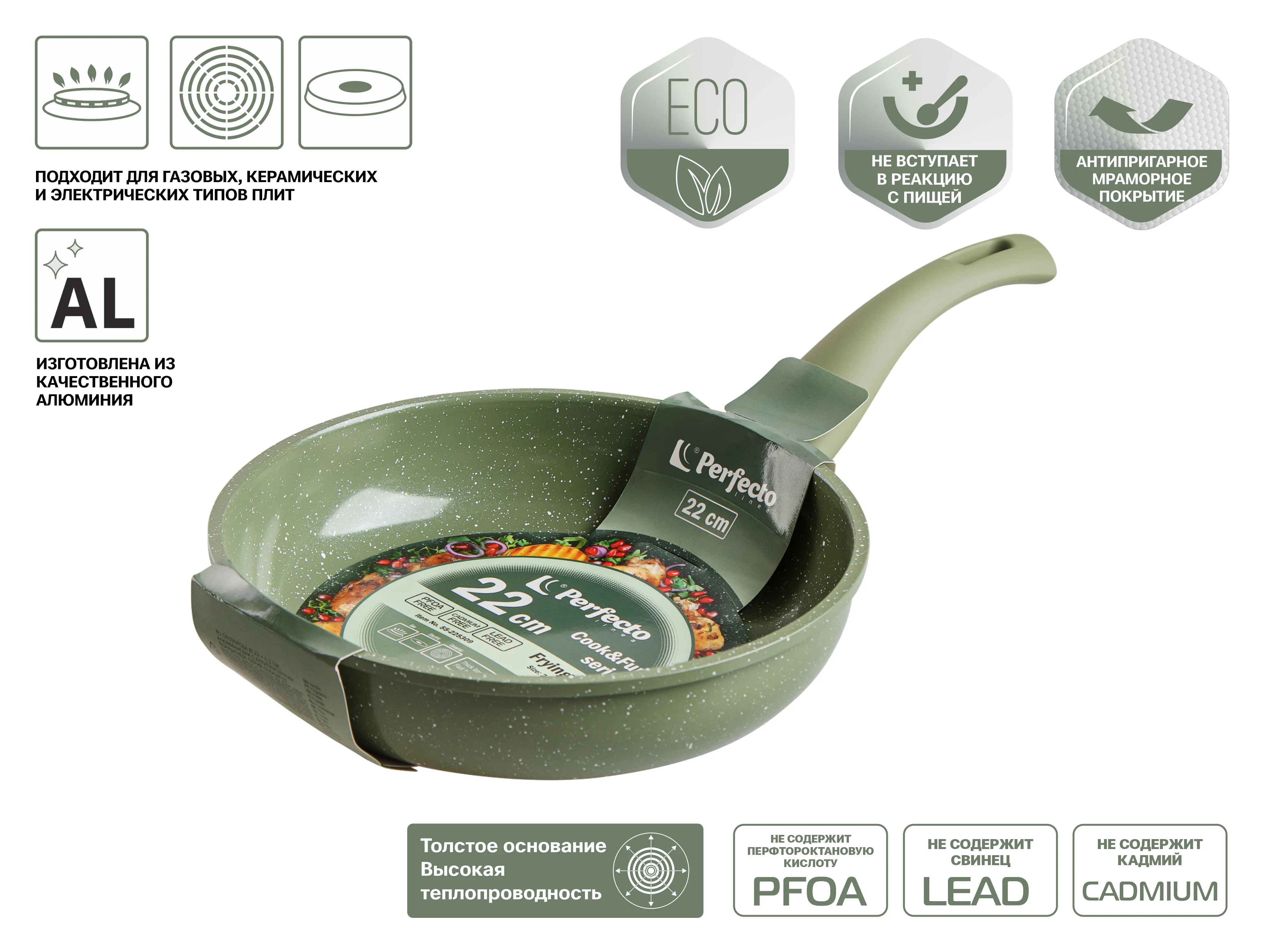 Сковорода ф 22х5.3 см, алюм., антиприг. покр., серия Cook&Fun, природный зелёный, PERFECTO LINEA