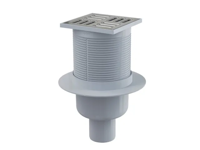 Сливной трап 105х105/50, подводка – прямая, решетка – нерж. сталь, гидрозатвор – мокрый, Alcaplast