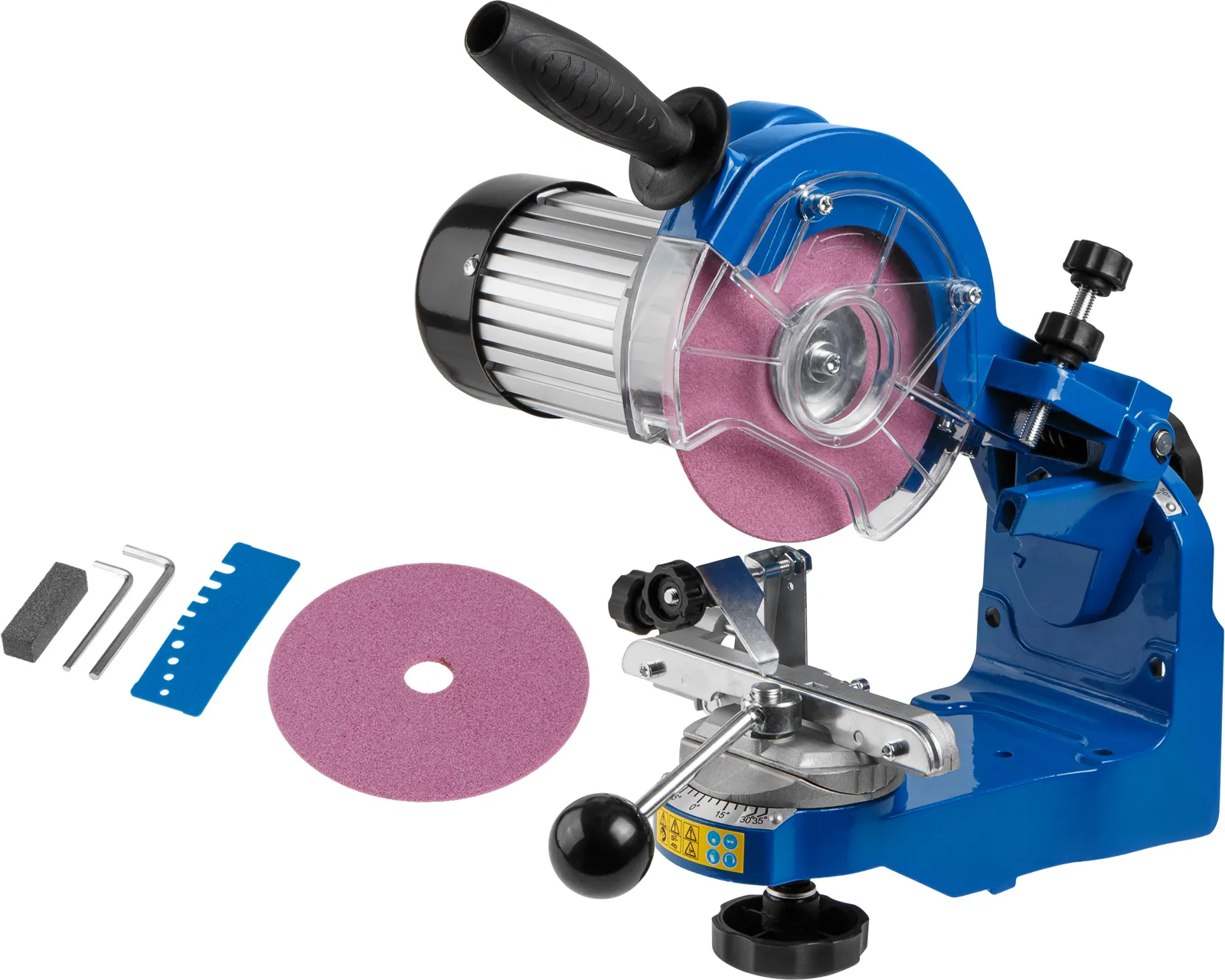 Станок для заточки пильных цепей BULL имеет надежный двигатель и ряд преимуществ для работы с различными видами цепей: прочное металлическое основание, большое количество регулировок, подсветка рабочей зоны, прозрачный защитный кожух, два заточных диска разной толщины в комплекте, возможность настенного крепления.