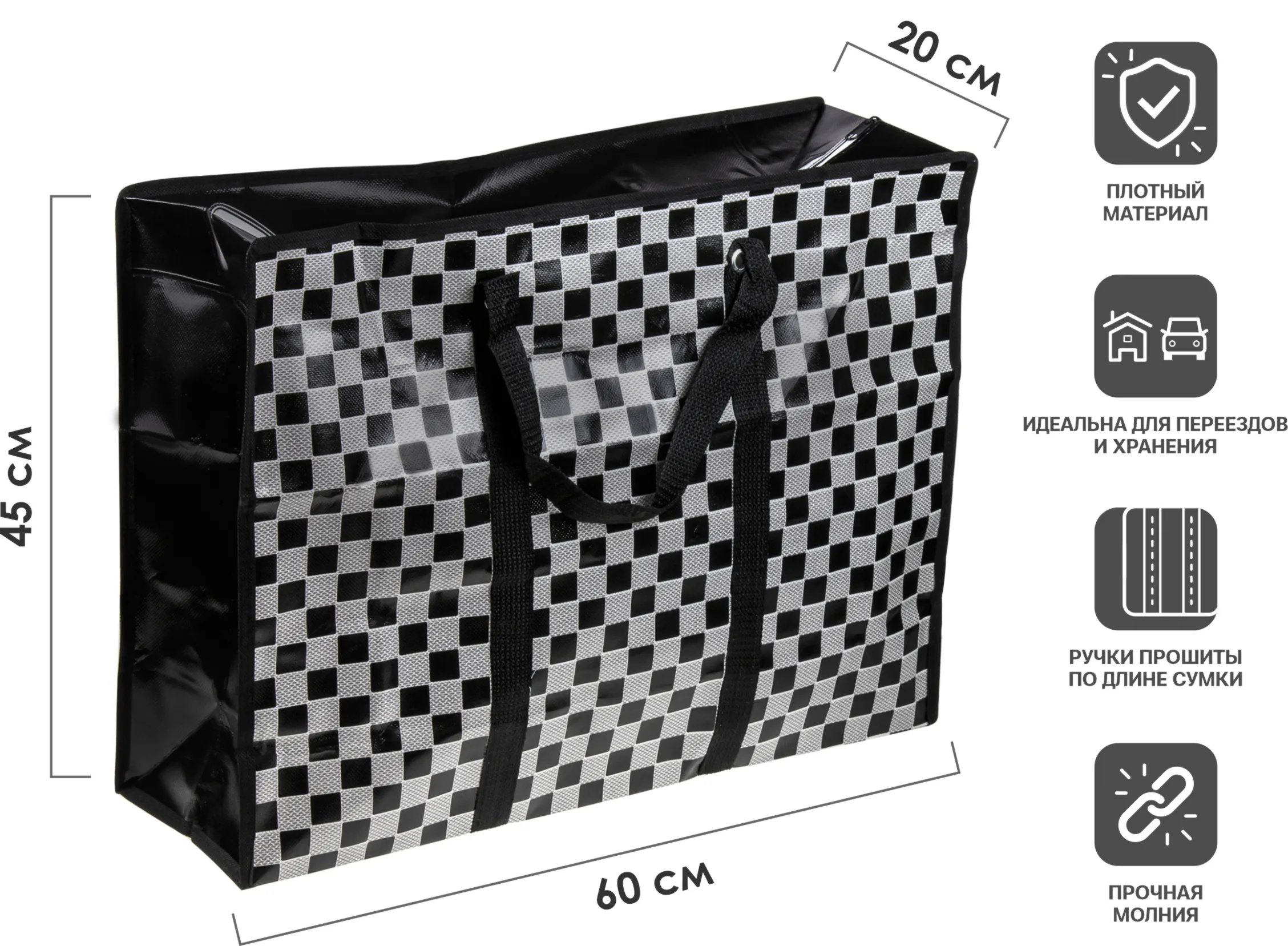 Плотная хозяйственная сумка. Предназначена для транспортировки разных грузов. Такие сумки используются как в логистике, так и в личных целях. Очень удобны для переездов. Сумка имеет укрепленные ручки и застежку-молнию, что сохраняет упаковываемый товар и вещи от грязи и пыли.