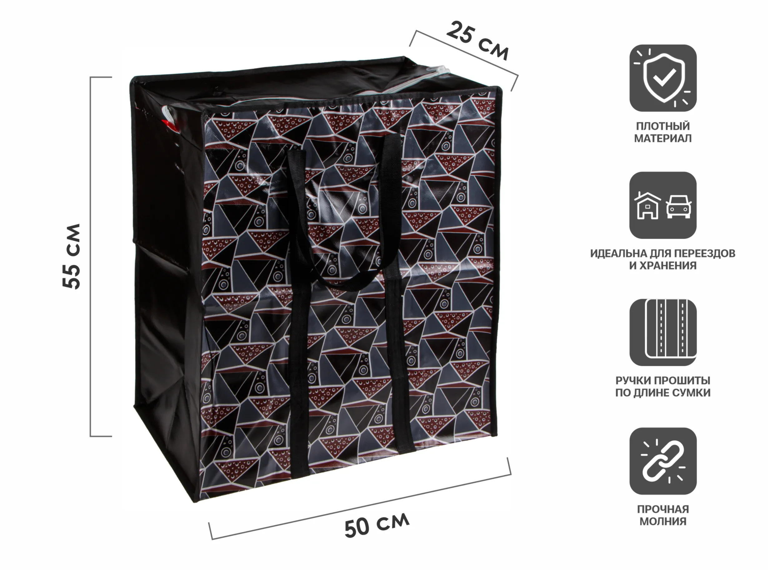 Плотная хозяйственная сумка. Предназначена для транспортировки разных грузов. Такие сумки используются как в логистике, так и в личных целях. Очень удобны для переездов. Сумка имеет укрепленные ручки и застежку-молнию, что сохраняет упаковываемый товар и вещи от грязи и пыли.