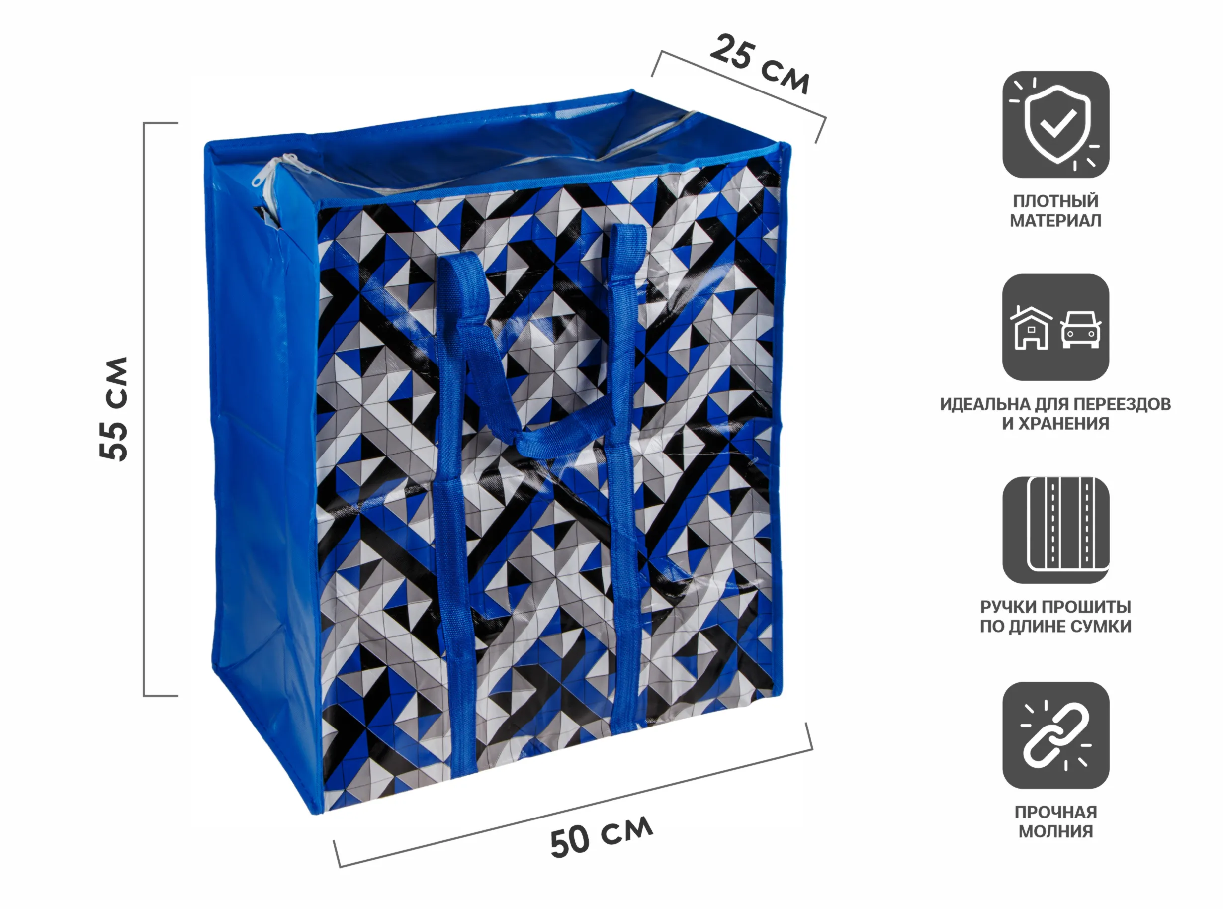 Плотная хозяйственная сумка. Предназначена для транспортировки разных грузов. Такие сумки используются как в логистике, так и в личных целях. Очень удобны для переездов. Сумка имеет укрепленные ручки и застежку-молнию, что сохраняет упаковываемый товар и вещи от грязи и пыли.