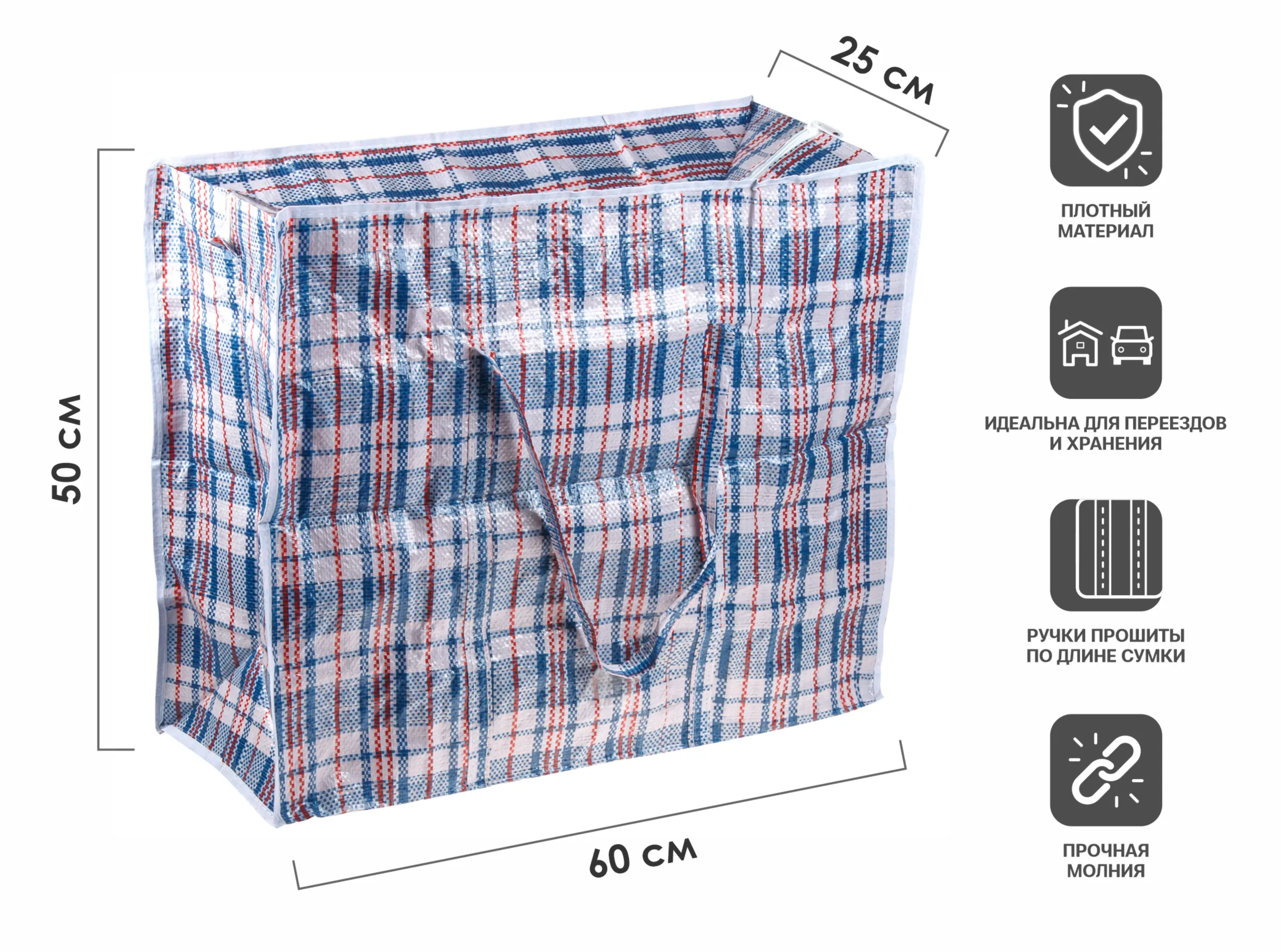 Плотная хозяйственная сумка. Предназначена для транспортировки разных грузов. Такие сумки используются как в логистике, так и в личных целях. Очень удобны для переездов. Сумка имеет укрепленные ручки и застежку-молнию, что сохраняет упаковываемый товар и вещи от грязи и пыли.