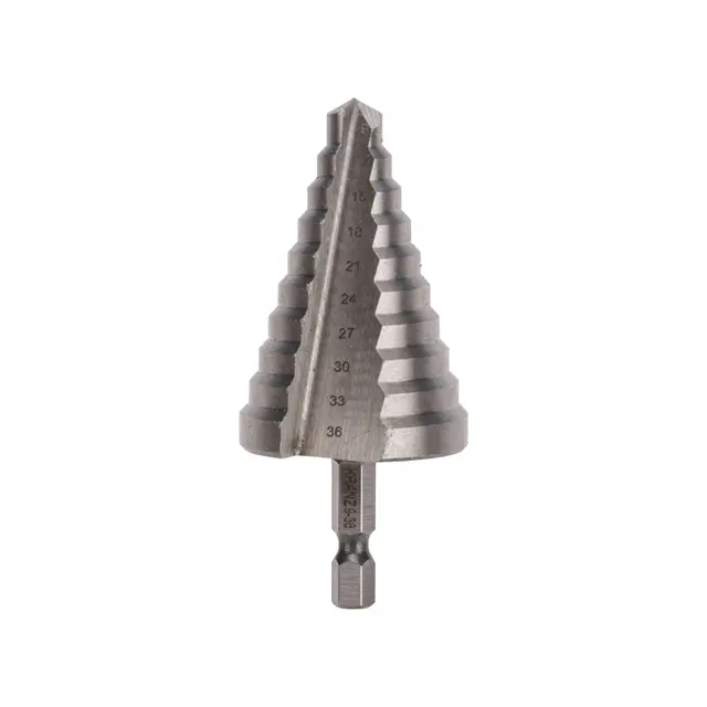 На каждой из 10 ступеней сверла нанесена маркировка фактического диаметра. Диапазон ступеней: 9, 12, 15, 18, 21, 24, 27, 30, 33, 36 (шаг 3 мм).