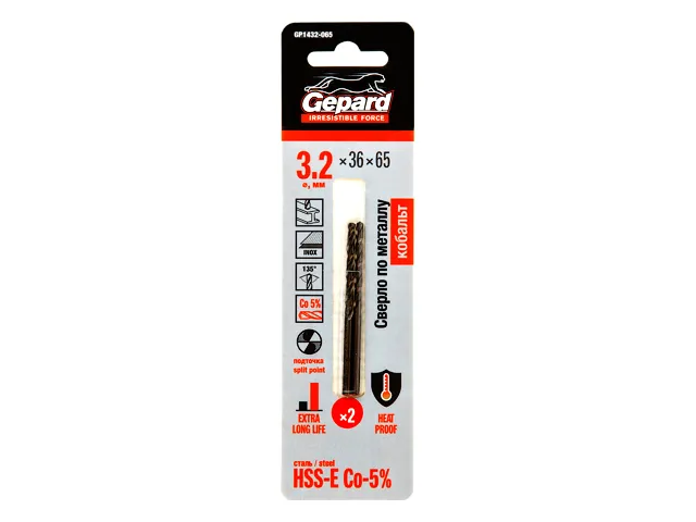 Сверло по металлу ц/х 3.2х36х65 мм HSS-Co, комплект из 2-х шт GEPARD