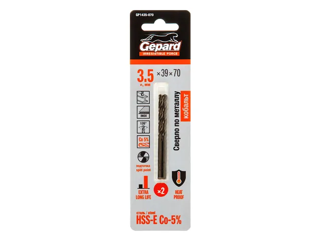 Сверло по металлу ц/х 3.5х39х70 мм HSS-Co, комплект из 2-х шт GEPARD