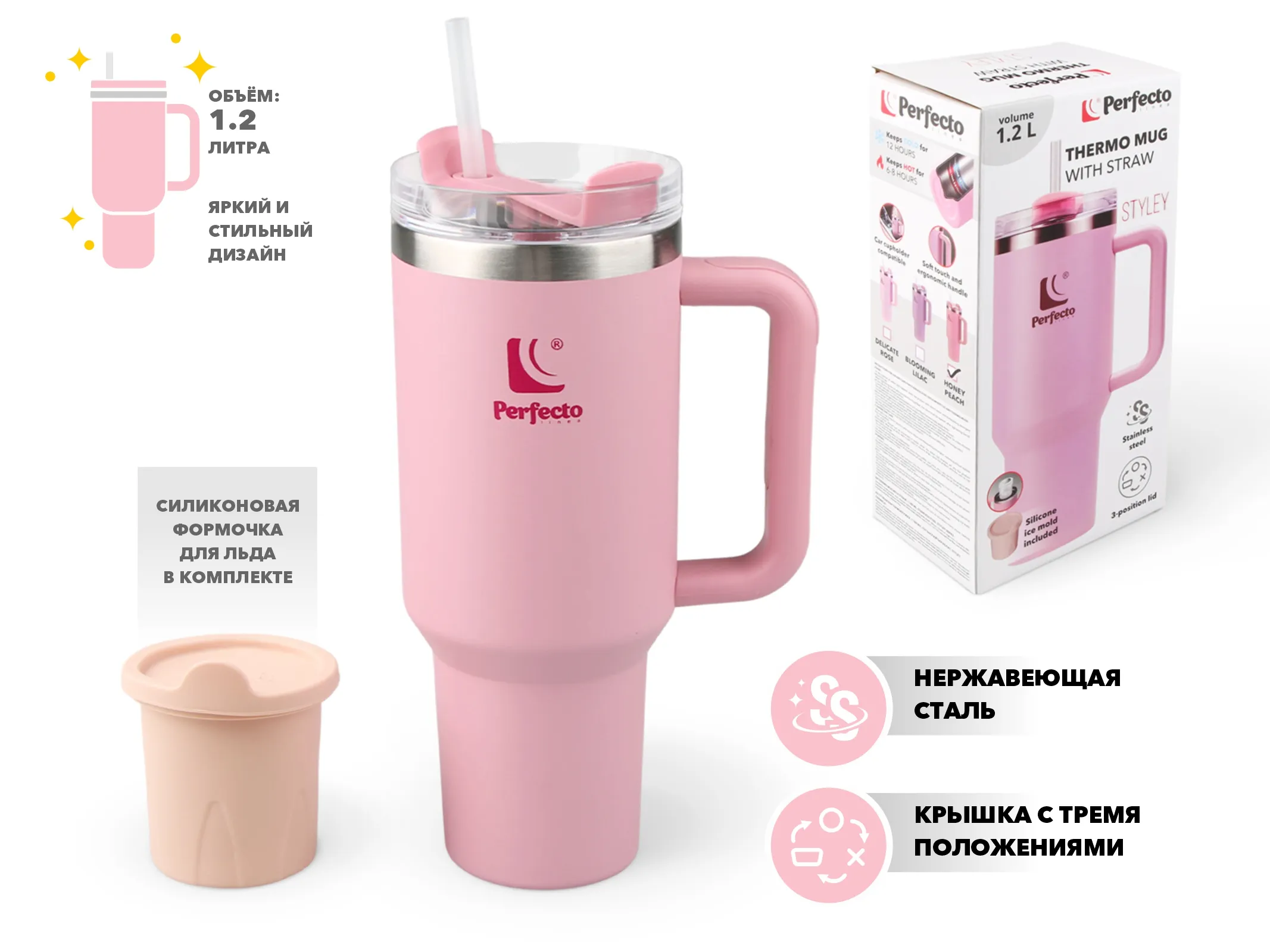 Термокружка с трубочкой полезным объёмом 1180 мл — стильный и практичный аксессуар для дома, работы и поездок. Особое внимание привлекает изящная квадратная ручка с эргономичным дизайном, которая обеспечивает удобный и комфортный захват. Кружка легко помещается в подстаканник автомобиля, а комплектная силиконовая форма для льда помогает дольше сохранять напитки свежими и прохладными.