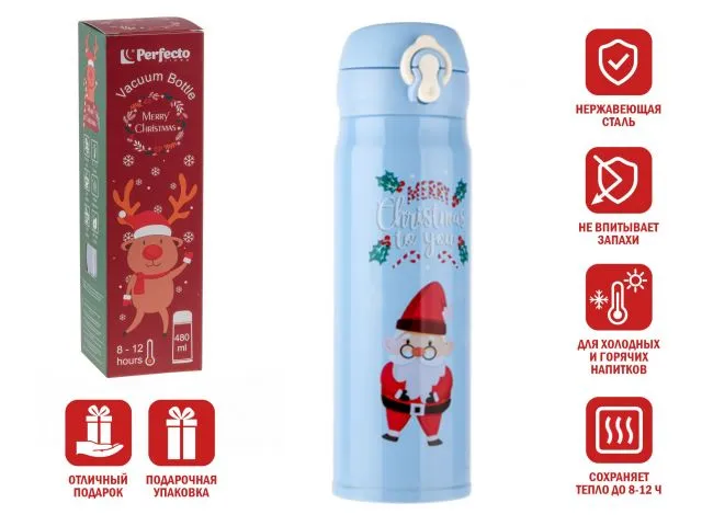 Термос, 480 мл, нержавеющая сталь, MERRY CHRISTMAS, голубой, Санта, PERFECTO LINEA