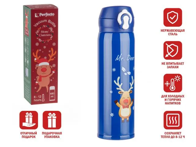 Термос, 480 мл, нержавеющая сталь, MERRY CHRISTMAS, синий, PERFECTO LINEA