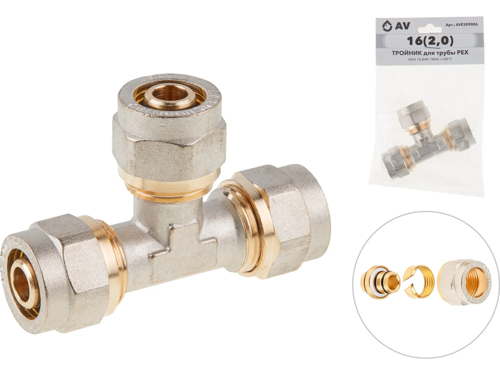 Тройник 16(2.0) для труб PEX, AV Engineering (инд. упак.)
