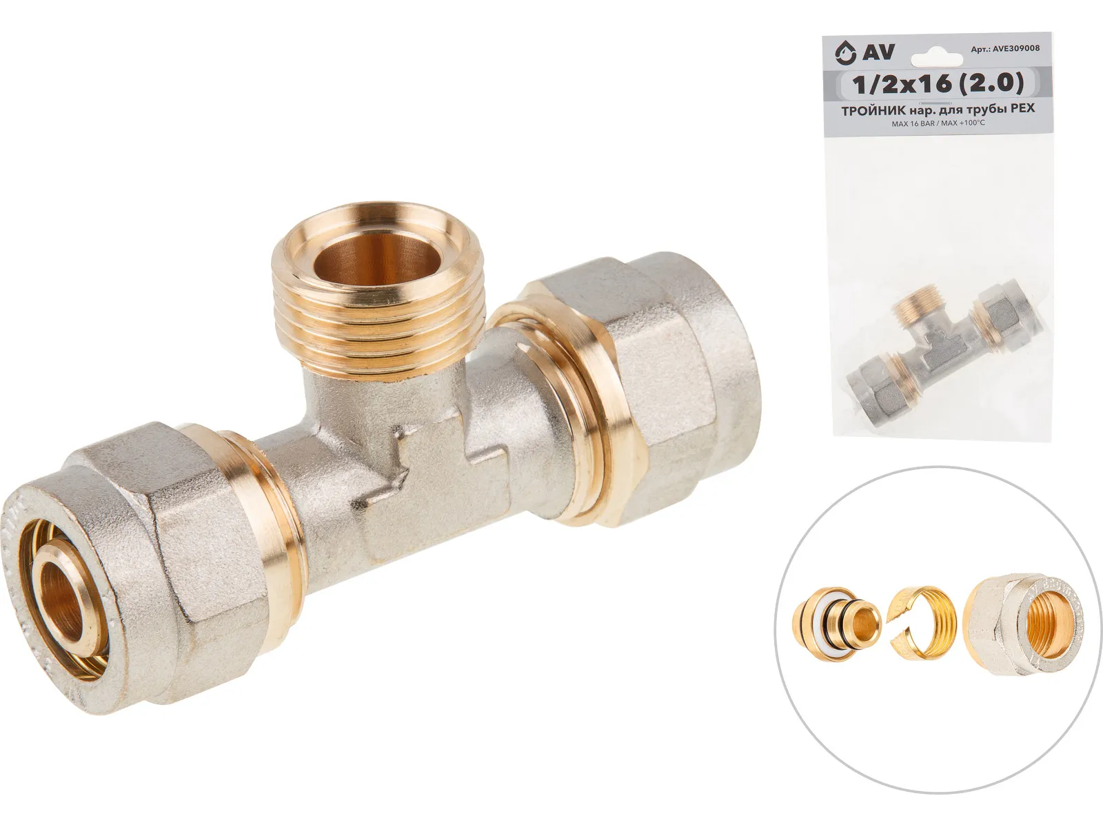 Тройник 16(2.0) х 1/2" нар. х 16(2.0) для труб PEX, AV Engineering (инд. упак.)