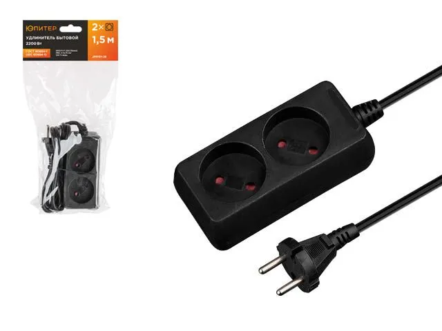 Удлинитель 1,5м (2 роз., 2,2кВт, б/з, ПВС 2х0,75) черный, Юпитер