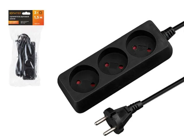Удлинитель 1,5м (3 роз., 2,2кВт, б/з, ПВС 2х0,75) черный, Юпитер