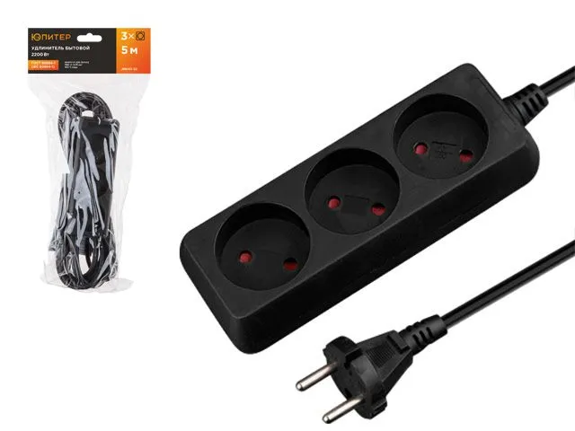 Удлинитель 5м (3 роз., 2,2кВт, б/з, ПВС 2х0,75) черный, Юпитер